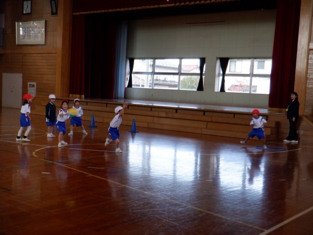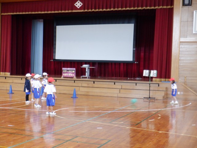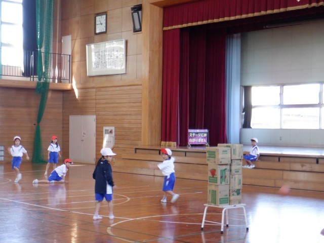 1年生は的あてゲームをしていました。的に当てるのが上手になり「~さんナイス!」という声が聞かれたり、両手を広げて的を守ったりとゲームをより楽しんでいる姿が見られました。