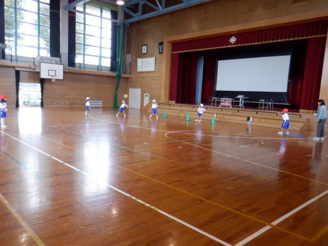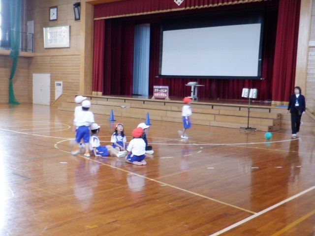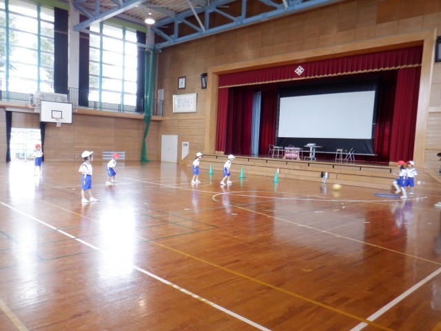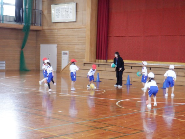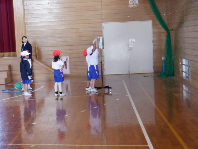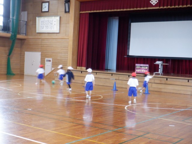 1年生は体育科でボールを使った運動をしていました。「あんたがたどこさ」ではボールを上手につきながら歌を歌っていましたが、「さ」のところで足の下にボールを通すこと難しく、みんな何度も挑戦していました。