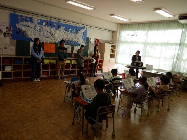 1年生は音楽科で「まねっこさん」という歌を歌っていました。楽しそうにまねっこしながら歌っていました。今後、様々なメロディやリズムを聞いてまねっこをする活動をします。