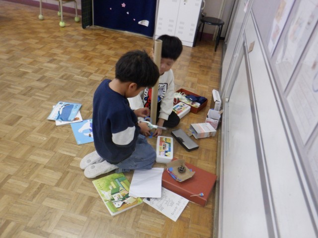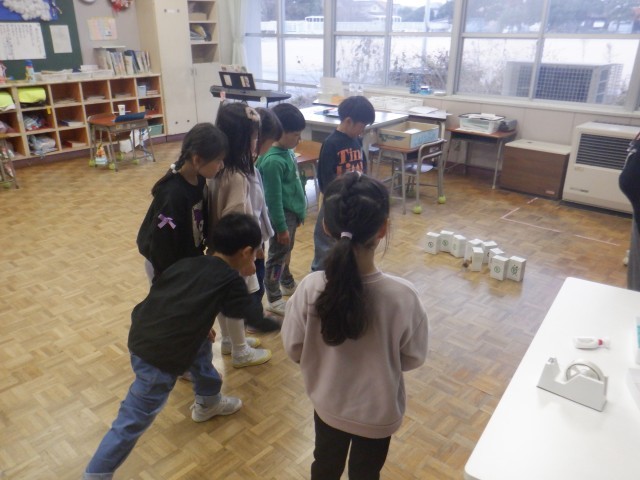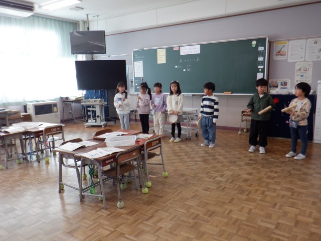 1年生は生活科で見つけた秋を使っておもちゃをつくり、「あきまつり」をする計画を立てています。今日は実際に友達のつくったおもちゃで遊んでみました。実際にやってみて「~したらいいと思う」等より楽しく遊べる提案をお互いにしていました