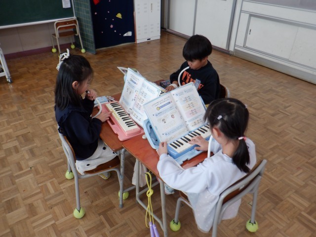 1年生は音楽科で鍵盤ハーモニカの練習をしていました。グループでの演奏を聞いてみると、みんなで演奏しているのではなく、一人ずつ順番に呼びかけ合うように演奏していました。お互いの音を聞きながら、お話しするように演奏を楽しんでいました。