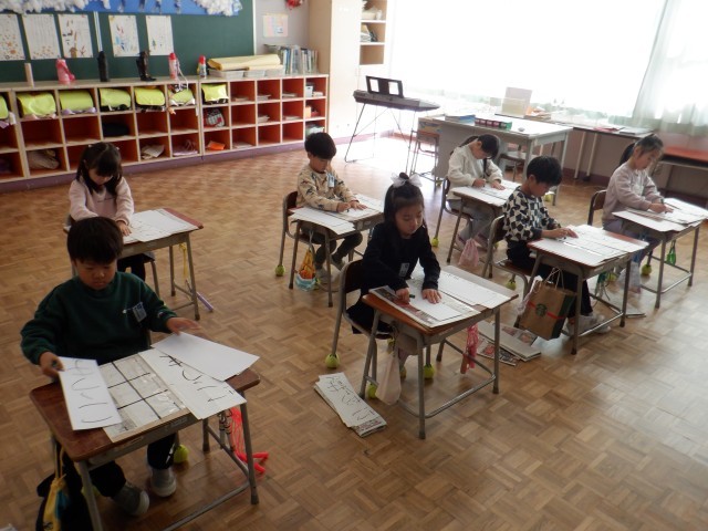 1年生は書初めの練習をしました。今日は平仮名のつながりを意識して書き、自分で書いた字を見比べて真剣に今日の1枚を選んでいました。硬筆墨でこいせんも書けるようになってきました。