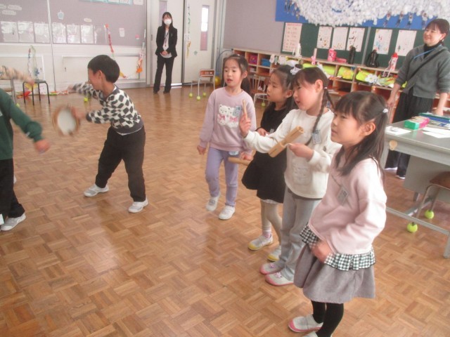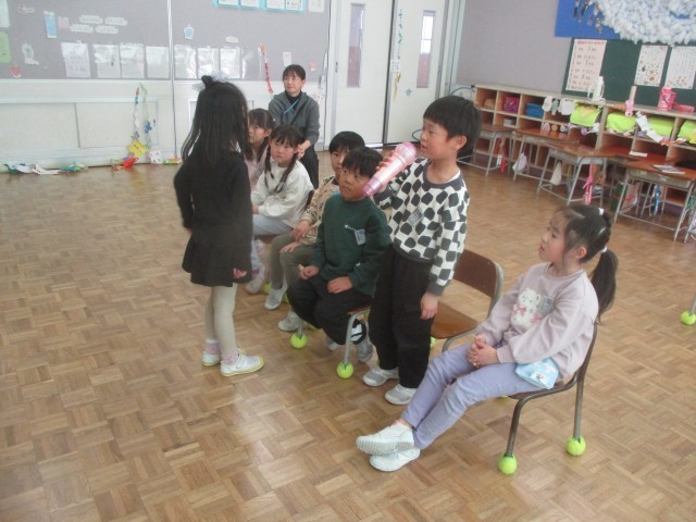 今日のクリスマス会では、一人一人が特技発表をしました。フラフープ、マット運動、縄とび、ものまね等、いろいろな工夫が見られた発表でした。みんなで作ったかるたで遊んだり、「あわてんぼうのサンタクロース」を打楽器を交えて歌ったり、楽しい時間となりました。