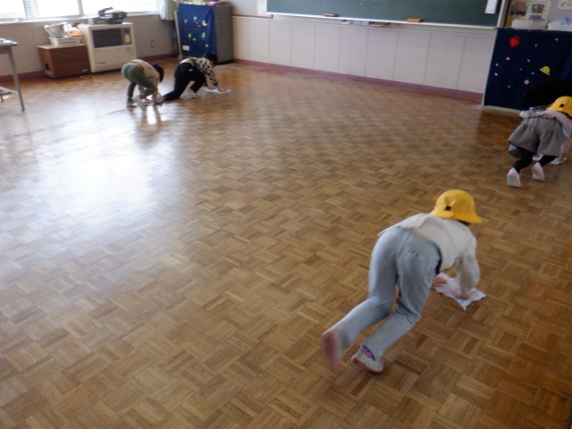 1年生は机を廊下に出して、教室の雑巾がけをしていました。両手でしっかり支えて、上手に雑巾がけをしていました。きれいになった教室は気持ちがいいです。