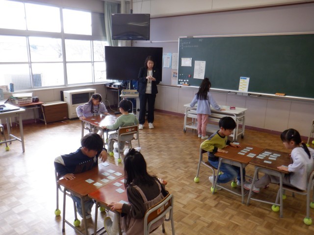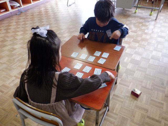 1年生は百人一首をしていました。何回かするうちに歌を覚えてきた子もいて、上の句だけでカルタを探し出す子もいました。友達との対決を楽しんでいます。