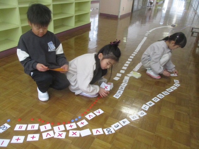 図工で「ならべてならべて」の学習をしました。さんすうぼっくすに入っているブロックやおはじきを、楽しそうに並べている子供たちです。