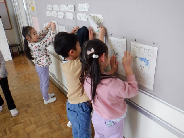 1年生は生活科で家族のお手伝いをがんばっています。お手伝いのコツを掲示したり、実際にやってみたお手伝いにシールを貼ったりして、がんばりをみんなで見合っています。