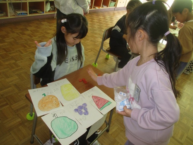 国語の時間に「ものの名まえ」を学習しました。子供たちは、お店の人役とお客さん役に分かれてお店屋さんごっこをしています。算数ぼっくすの中のお金を使って、楽しそうに買い物をしました。