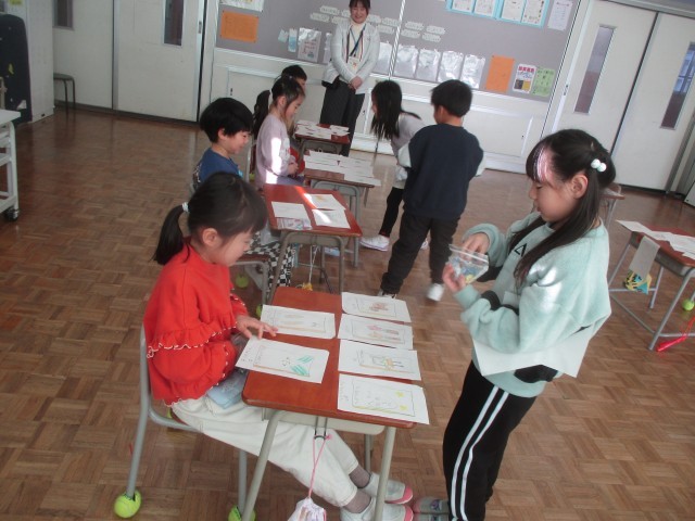 図工で「ならべてならべて」の学習をしました。さんすうぼっくすに入っているブロックやおはじきを、楽しそうに並べている子供たちです。
