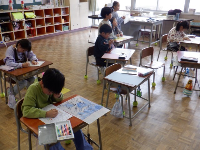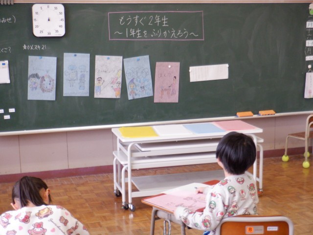 1年生は生活科で1年生の思い出を振り返っていました。楽しかったこと、できるようになったこと等を絵で表していました。