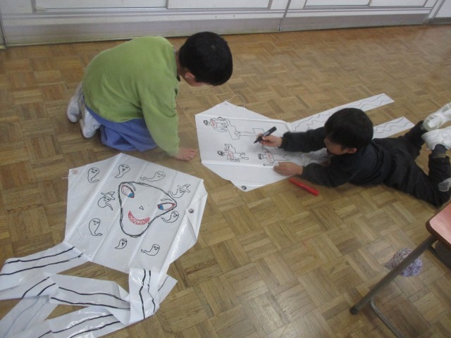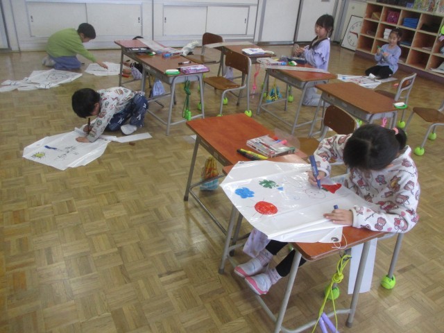 生活科の昔の遊びの学習で、凧揚げをします。今日は、凧に、思い思いの絵を描きました。グラウンドで揚げる日が楽しみです。