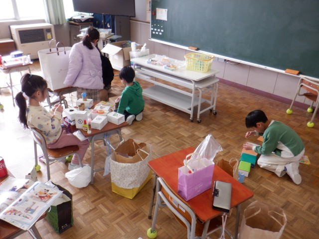 1年生は図画工作科で箱を使った創作活動をしていました。いろいろな形の箱を、並べたり、積み重ねたりして様々なものをつくっていました。どのように付けたらよいか友達と考えるなど、協力し合って活動を進めています。