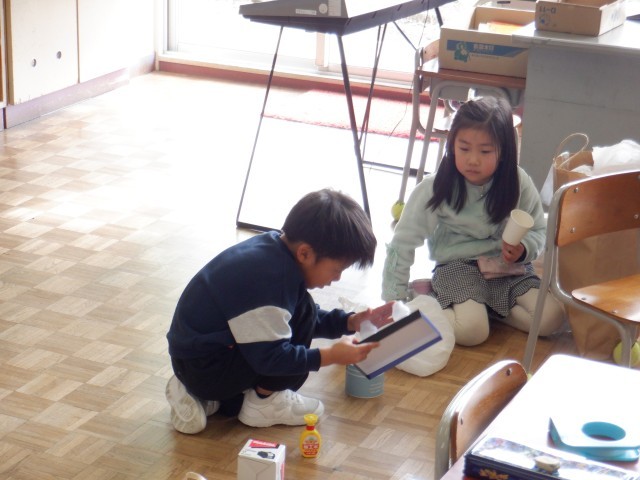 国語の時間に「ものの名まえ」を学習しました。子供たちは、お店の人役とお客さん役に分かれてお店屋さんごっこをしています。算数ぼっくすの中のお金を使って、楽しそうに買い物をしました。