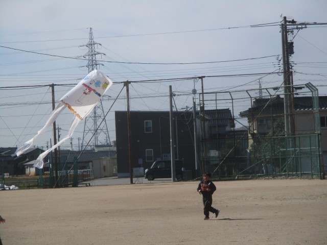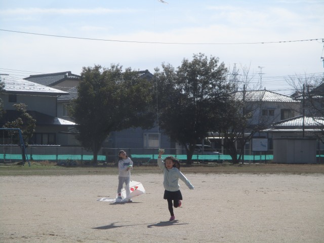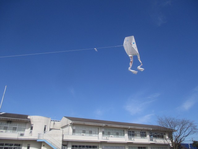 今日は快晴で、風もあって、絶好の凧揚げ日和でした。子供たちは、グラウンドを一生懸命走りながら、「揚がった!」「高い!」と嬉しそうに話していました。