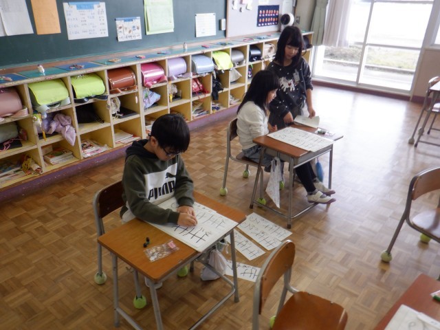 2年生は書初め練習をしていました。漢字の「生」が難しいと言っていた子供たちでしたが、手本をよく見て丁寧に書いていました。自分の書いた作品を見比べて、今日の1枚を真剣に選んでいました。