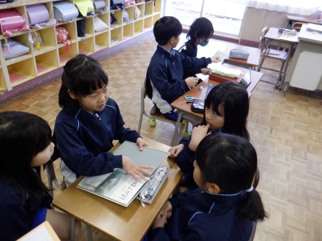 2年生は国語科で絵から想像を広げてお話をつくる学習をしていました。お話は仕上がり、絵を書き込んだり、表紙をつくったり、完成した作品を読み直したりしていました。お互いの作品も気になっているようで、次の時間に友達と読み合います。