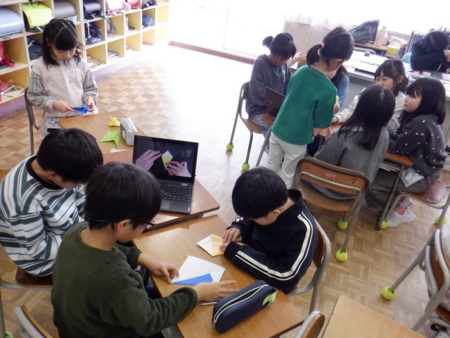 2年生は6年生の卒業をお祝いする飾りをつくっていました。つくり方を調べたり、教え合ったりしながら、6年生に喜んでもらおうと素敵な飾りをみんなでつくっています。