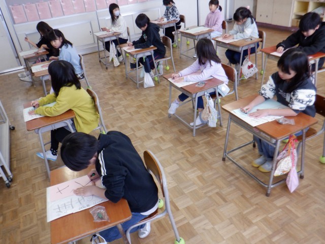 3年生は習字で漢字を書いています。前回「とめ」「はね」「はらい」に気を付けて練習し、今日は中心を意識して書きました。縦の中心、横の中心、文字の中心に気を付けながら、集中して書いていました。