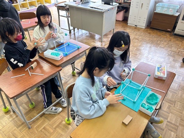 2年生は算数科で箱の形の学習をしています。今日は粘土とストローを使って、箱の形をつくりました。長さの違うストローを何本、どこに使えばよいか友達と相談しながら箱の形をつくりあげました。