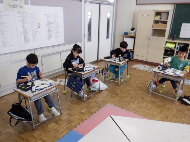 3年生は書写の時間に習字をしました。3年生から始まった毛筆の学習で学んだことを思い出しながら、「はね」「はらい」等に気を付けて字を書きました。字を書く姿勢や、準備・後片付けも、みんな上手になりました。