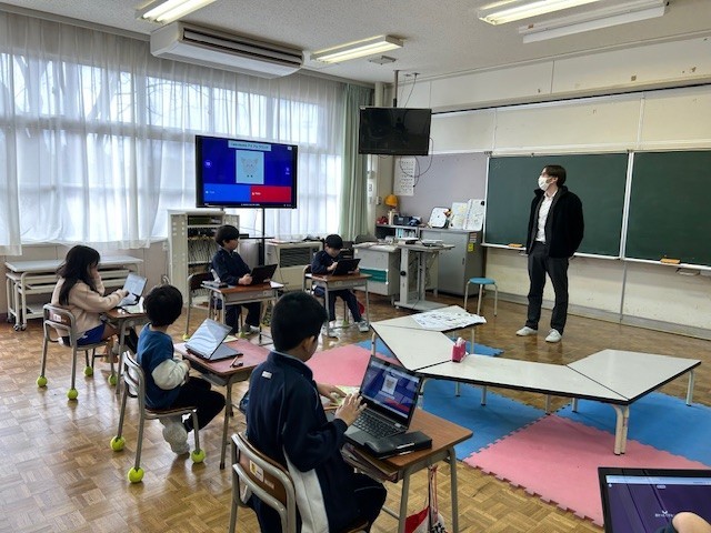 3年生は外国語活動で、ゲームを使ってこれまで学習したことの振り返りをしました。「large」「circle」等の言葉の意味を考えたり、言葉を並べ替えて文をつくったりと、楽しみながらこれまでの復習をしていました。