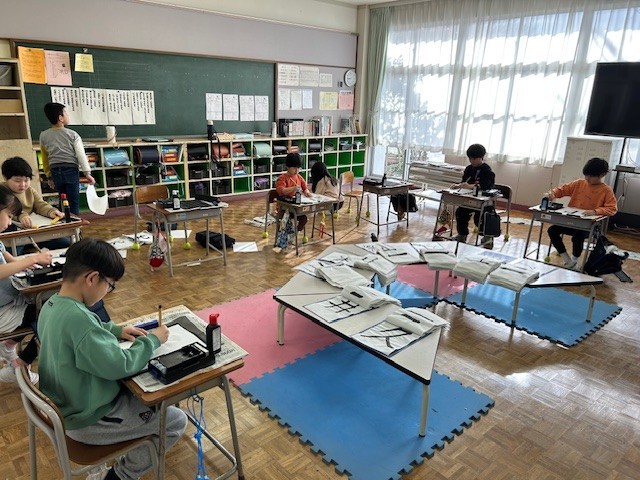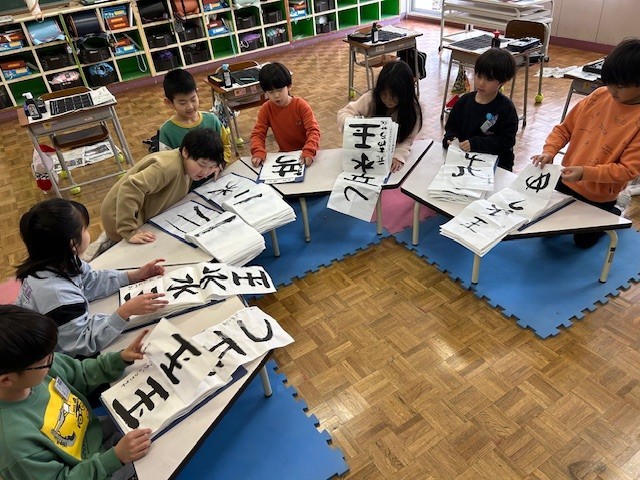 3年生は書写の時間に習字をしました。3年生から始まった毛筆の学習で学んだことを思い出しながら、「はね」「はらい」等に気を付けて字を書きました。字を書く姿勢や、準備・後片付けも、みんな上手になりました。