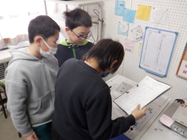 5,6年生がスキー学習で学校にいなかったため、今日は4年生が5、6年生に代わって放送やトイレ掃除をがんばってくれました。1週間前から放送のかけ方を教えてもらい、今日は4年生だけが給食や読書タイムの放送をすべてかけました。来年度の委員会活動に向けて自信にもつながったようです。