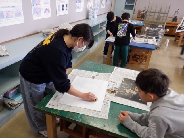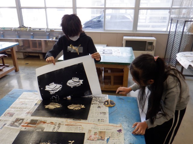 4年生は図画工作科で、版画を刷る活動をしていました。友達と協力し合い、刷り上がりにワクワクしながら活動していました。
