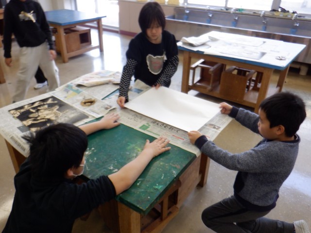 2月19日(木)4年生 今日の授業風景(版画の刷り)