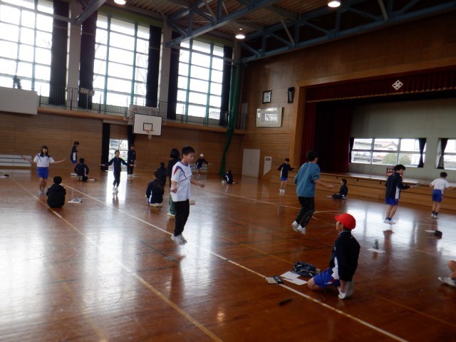 6年生は体育科で縄跳びをしていました。1分間で前跳び、後ろ跳び、二重跳びを何回跳べるか毎回記録して、前回よりたくさん跳べるよう目当てをもって取り組んでいます。