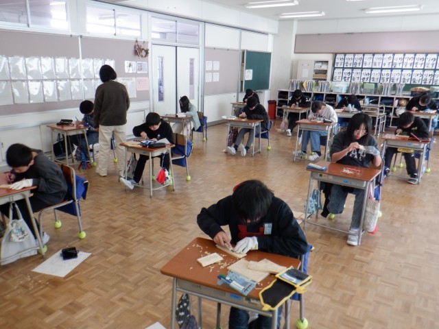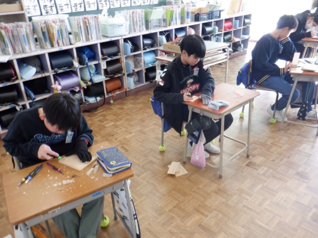 6年生は卒業製作に取り組んでいます。箱の表や側面に6年間の思い出等を絵にして彫っています。