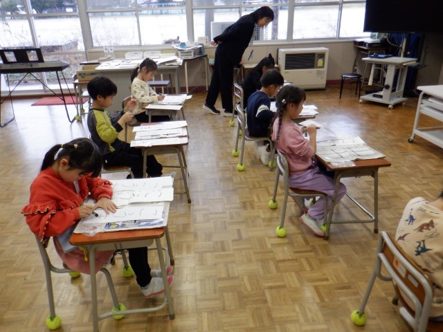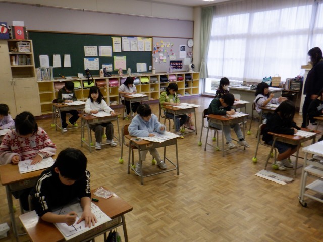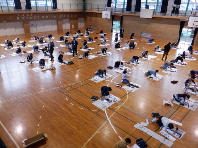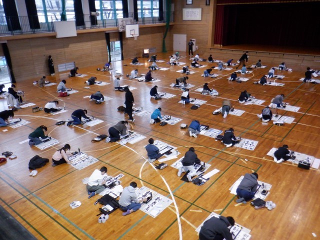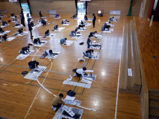 その後、1、2年生は教室で、3~6年生は体育館で、新年の誓いを胸に書初め大会を行いました。