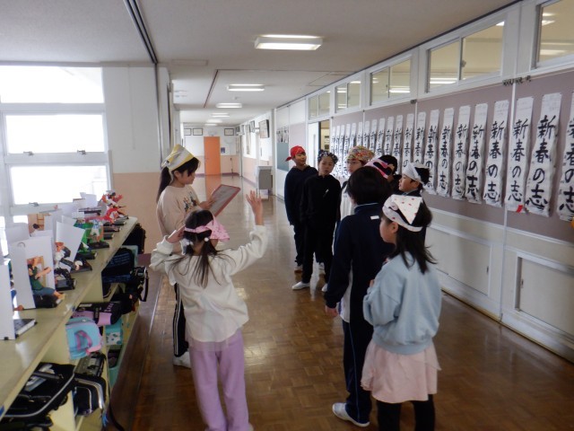 その後、1、2年生は教室で、3~6年生は体育館で、新年の誓いを胸に書初め大会を行いました。