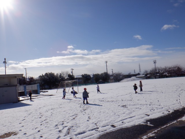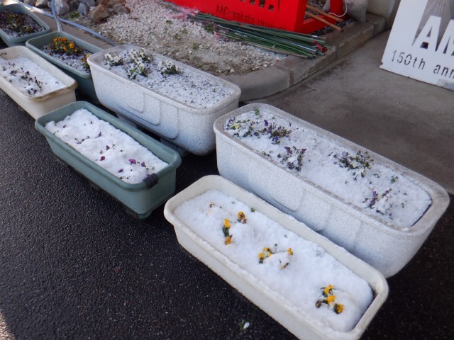 昨夜の雪でうっすらと白い景色になりました。プランターの花たちは寒そうなのですが、子供たちは元気にグラウンドで雪遊びをしていました。
