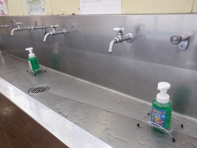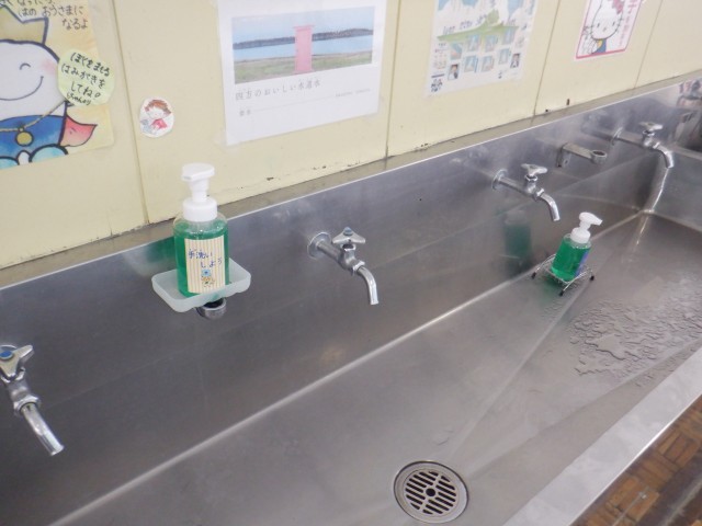 シャボネット容器を新しいものにしました。ポカぞう、まもルンのイラストのラベルがついた四方オリジナルシャボネットです。ポカぞう、まもルンと一緒に手洗いをして元気な四方っ子を目指してもらいたいです。