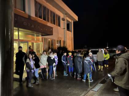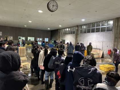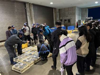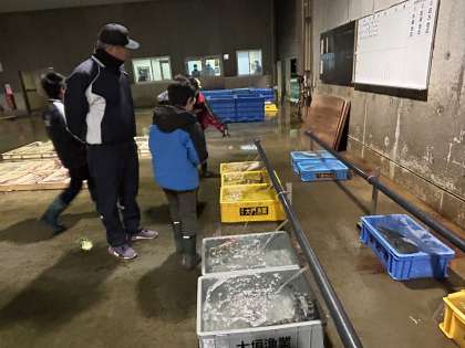 6年生は、四方漁港にせりの見学にきました。朝5時半という早い時間ですが、6年生全員集まりました。まだ暗い中ですが、子供たちのワクワクが伝わってきます。