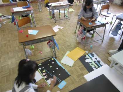 2年生は図画工作科で、紙を切ったその形から想像を広げて作品をつくっていました。「いろいろな色を使いたい」という子供の思いから、黒い台紙に白だけでなく他の色も貼っていくことで、より楽しい作品になってきました。