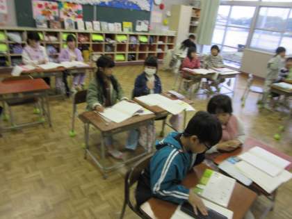 1年生は国語科で「たぬきの糸車」というお話しを学習しています。登場人物の気持ちについて考え、ペアや全体の場で伝え合っています。