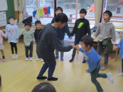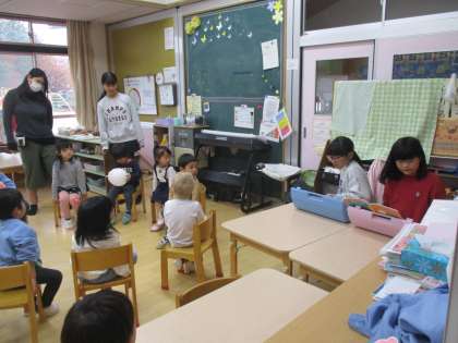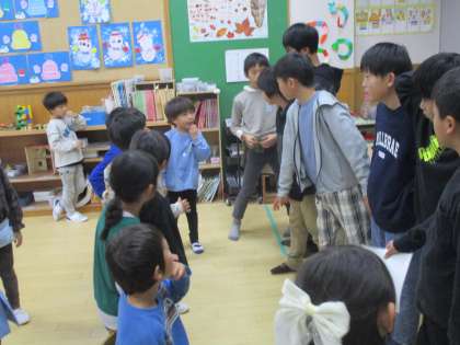 年長児のクラスでは、絵本の読み聞かせや「はないちもんめ」をしていました。「はないちもんめ」では、園児とぎゅっと手を握り、誰を選ぶかを輪になって相談していました。園児の思いを大切にした発言をしていた5年生です。