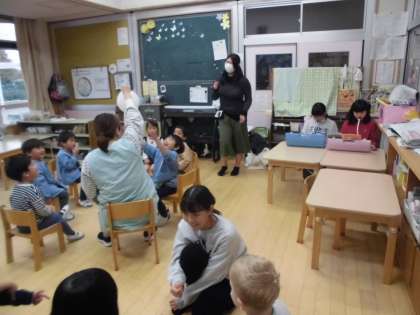 年中児のクラスでは、カードめくりやじゃんけん列車をしていました。園児の身長に合わせて活動したり、園児が安全に遊べるように見守る場所を考えたりしていました。 -