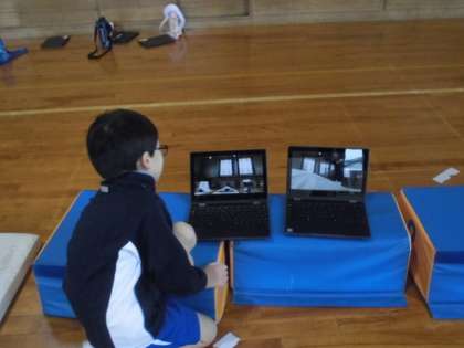 3年生の4時間目は、体育の学習でした。台上前転では、これまで跳び箱を2つつなげて練習していた子供も1つの跳び箱に挑戦したり、開脚跳びでは、6段に挑戦したりする子供もいました。また、動画で撮影した自分の動きを見て練習に生かすなど、どんどんステップアップしていく3年生です。