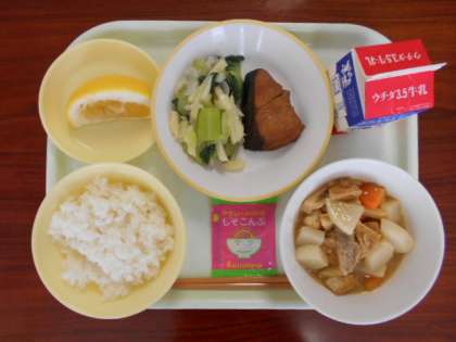 5月24日(月)の給食は、「ごはん、牛乳、ふくらぎのてりやき、じゃがいもの千切り炒め、かぶと厚揚げの中華煮込み、河内晩柑、しそこんぶふりかけ」でした。