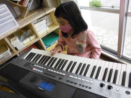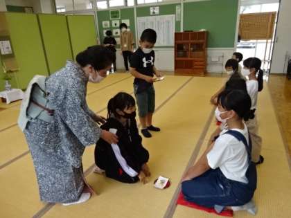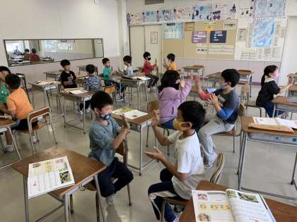 音楽科の学習で「茶つみ」の歌に合わせて、リズム遊び(手遊び)をしました。まだ口ずさみながら行うことはできませんが、みんなとても楽しそうでした。家でも一緒にやってみてください。