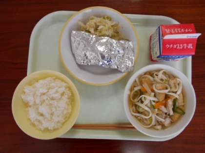 5月28日(金)の給食は、「ごはん、牛乳、かしわうどん、鯖の銀紙焼き、甘酢和え」でした。