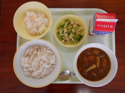 5月26日(水)の給食は、「むぎごはん、牛乳、たべキリンハヤシ、豆豆サラダ、フルーツヨーグルト」でした。