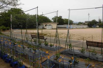きゅうりを育てている子供たちから「180センチメートルぐらいの支柱とネットが必要だと思う」という意見が出たので、用務員さんに手伝っていただいて、ネットを一緒に張りました。