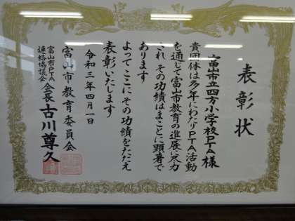 5月26日(水)四方小PTAが富山市PTA連絡協議会より表彰を受けました