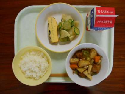 5月27日(木)の給食は、「ごはん、牛乳、えごまいり卵焼き、かふう和え、酢豚」でした。