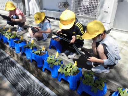 土日のうちにずいぶん葉の数が増えました。今日は自分のパソコンを持ってカメラのアプリを使ってあさがおの写真を撮りました。初めて教室外にパソコンを持ち運ぶので、慎重に靴を履き替え、移動しました。教室に戻り、写真を見て拡大したりしながら観察カードを書きました。