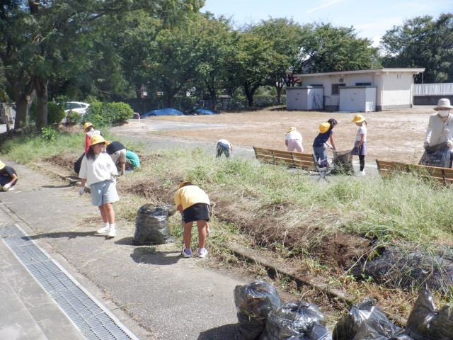 2年生は生活科で野菜を育てていました。晴天にも恵まれ、たくさんの野菜が収穫できました。収穫の時期も終わったため、今日は畑の片付けをしていました。支柱やネット、草をみんなで協力して片づけていました。